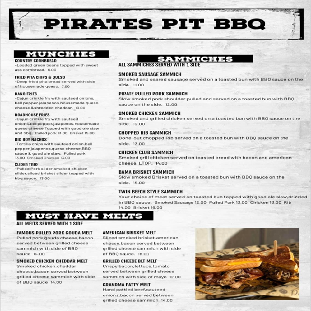 Pirates Pit is not just a restaurant; it’s a celebration of flavor, where smoked meats and cheesy delights come together. The must-try sensation here is undoubtedly their Melts. Imagine biting into the Famous Pulled Pork Gouda Melt—tender pulled pork, rich gouda, and crispy bacon sandwiched between two slices of grilled cheese, complemented by a side of BBQ sauce. For fans of poultry, the Smoked Chicken Cheddar Melt offers savory smoked chicken mingling with luscious cheddar, all wrapped in cheesy goodness. If you're a beef lover, don’t miss the American Brisket Melt, featuring sliced smoked brisket that is sure to woo your taste buds.